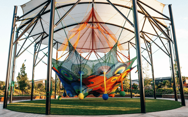 Las redes colgantes de Ropeland se crean mediante figuras de ganchillo ensambladas.